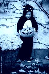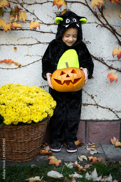 Cheerful Boy wearing in Halloween bat vampire costume with jack-o-lantern pumpkin