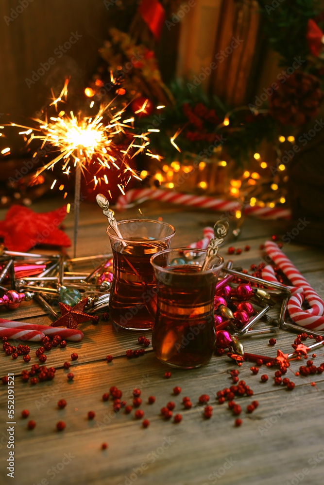 traditional Turkish glass cups with tea, candy, spakler and decor on wooden table. Christmas and new year holidays concept. winter festive season