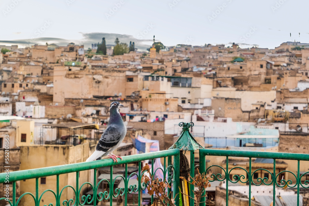 Pigeon resting on rooftop terrace in Medina, Fez, Morocco