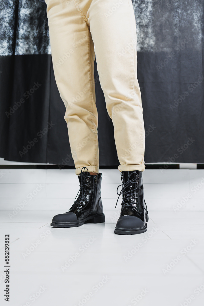 Fashionable women's stylish leather boots. Black women's boots made of genuine leather. New collection of winter shoes for stylish girls.