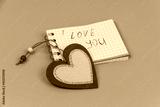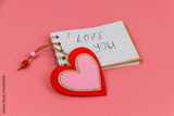 Heart and notepad with handwritten text " I Love You" on pastel pink background. Valentine Day concept