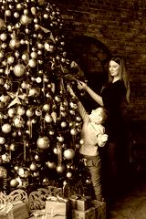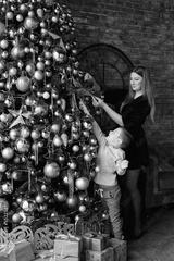 happy young mom and her son at home with a Christmas tree. decorate for the holiday