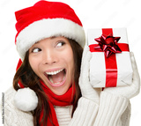 Christmas woman holding present excited. Young happy woman wearing Santa hat looking to side showing Christmas gift isolated cutout PNG on transparent background. Beautiful young Santa