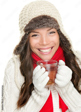 winter woman drinking tea wearing warm winter clothing, sweater, gloves and scarf. Beautiful mixed race Asian Caucasian girl model isolated cutout PNG on transparent background.