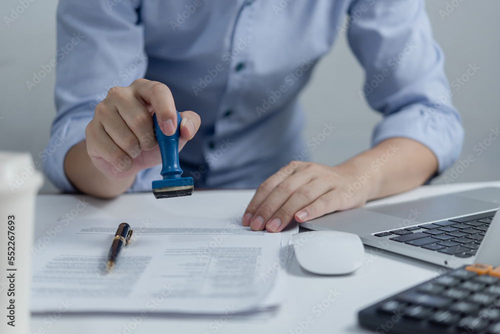 Man stamping approval of work finance banking or investment marketing documents on desk.