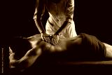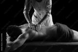 Sports massage. Physical therapyst massaging neck and shoulder of muscular male athelete. Physiotherapist massaging male scapula trapezius.