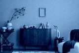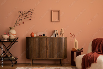 Warm and cozy living room interior with wooden commode, stylish armchair, patterned plaid, vase with dried flowers, sculpture, ornament on the wall and personal accessories. Home decor. Template.