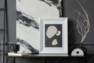 Aesthetic composition of living room interior with mock up poster frame, black vase with dried flowers, sculpture, book, cup, dark wall with stucco and personal accessories. Home decor. Template.