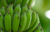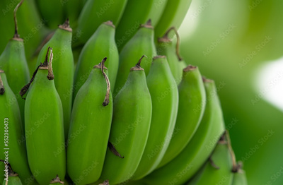 Closeup bunch of raw green cultivated bananas in the banana garden. Cultivated banana plantation. Tropical fruit farm. Herbal plant for treating diarrhea and gastritis. Agriculture farm. Organic food.