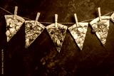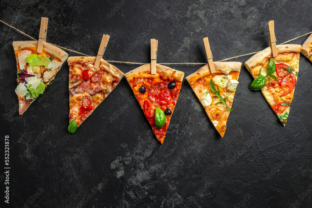 Different pieces of pizza on a string with clothespins dark background. Long banner format. top view