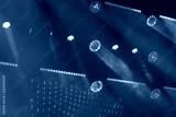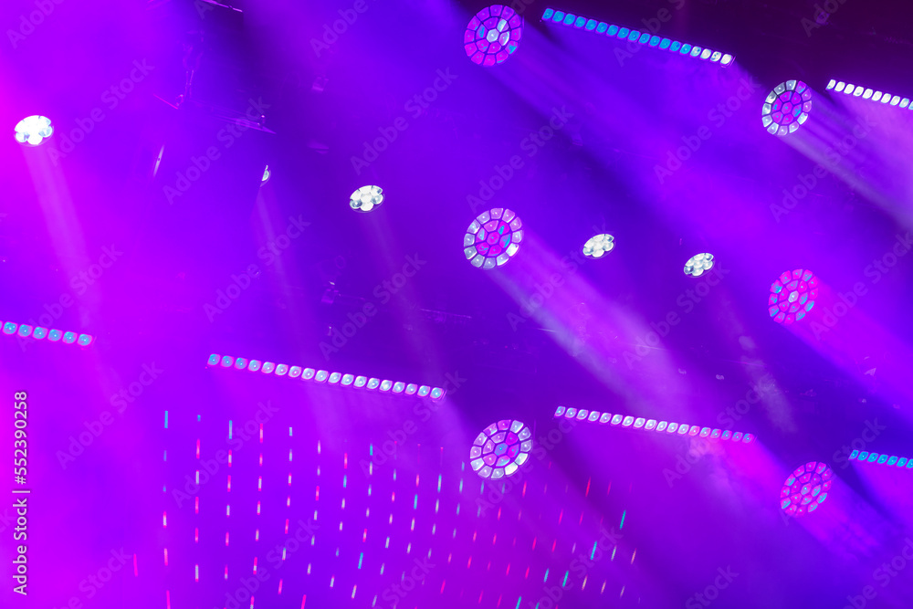 The neon purple light from the spotlights of the cannon beams on the stage is professionally exposed.