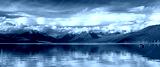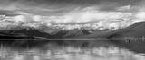 Panorama of snow-capped mountain peaks and red boat under dramatic sky reflected in the calm waters of Lake McDonald, Glacier National Park, Montana