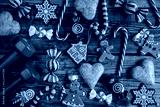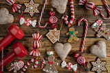 Red dumbbells, Christmas ornaments, pendant decorations, decorative candy canes, gingerbread cookies. Fitness holiday season winter flat lay composition. Gym workout training concept.