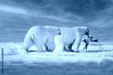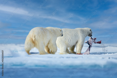 Nature - polar bear on drifting ice with snow feeding on killed seal, skeleton and blood, wildlife Svalbard, Norway. Beras with carcass, wildlife nature. Carcass with blue sky and clouds.