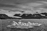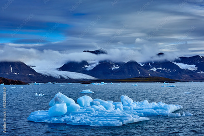 Arctic Svalbard. Land of ice. Travelling in Arctic Norway. White snowy mountain, blue glacier Svalbard, Norway. Iceberg in North pole. Blue sky with ice floe.