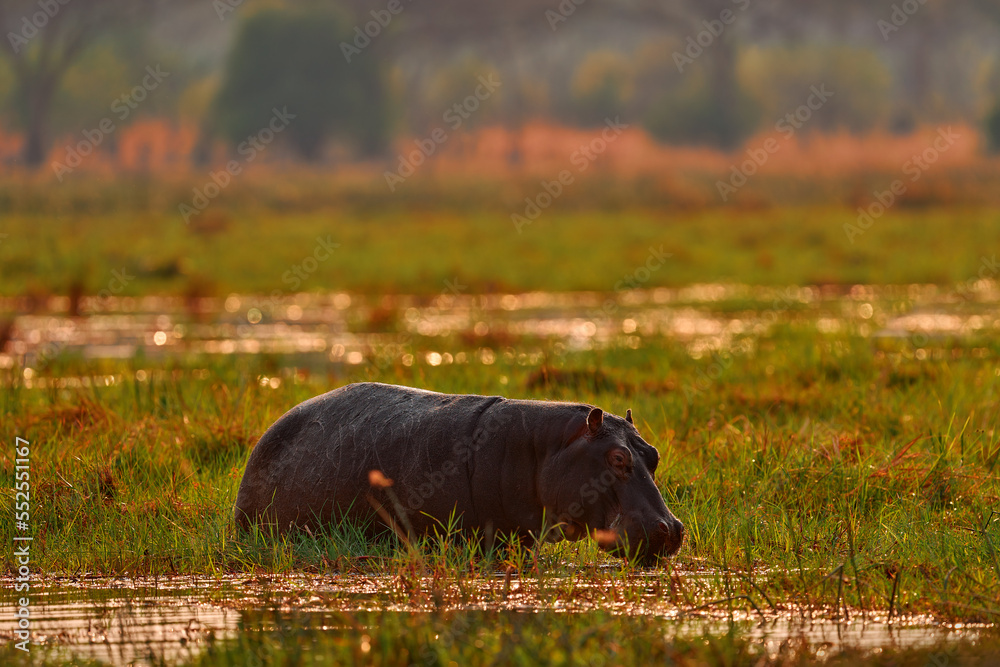 Botswana wildlife. Hippo with open mouth muzzle with toouth, danger animal in the water. Detail portrait of hippo head. Hippopotamus amphibius capensis, with evening sun, animal in the nature.