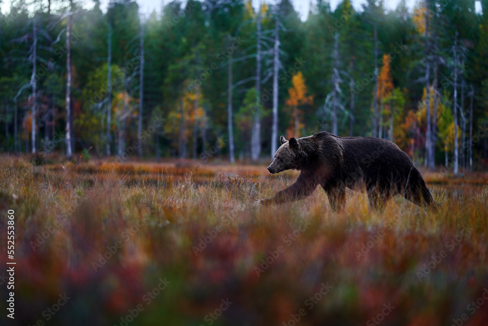 Autumn nature. Bear wide angle lens in yellow forest. Fall trees with bear, mirror reflection. Beautiful brown bear walking around lake, fall colors, Finland, Europe.