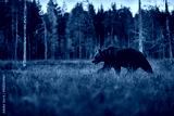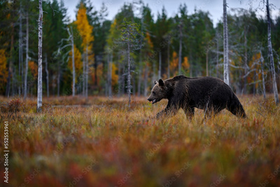 Autumn nature. Bear wide angle lens in yellow forest. Fall trees with bear, mirror reflection. Beautiful brown bear walking around lake, fall colors, Finland, Europe.