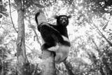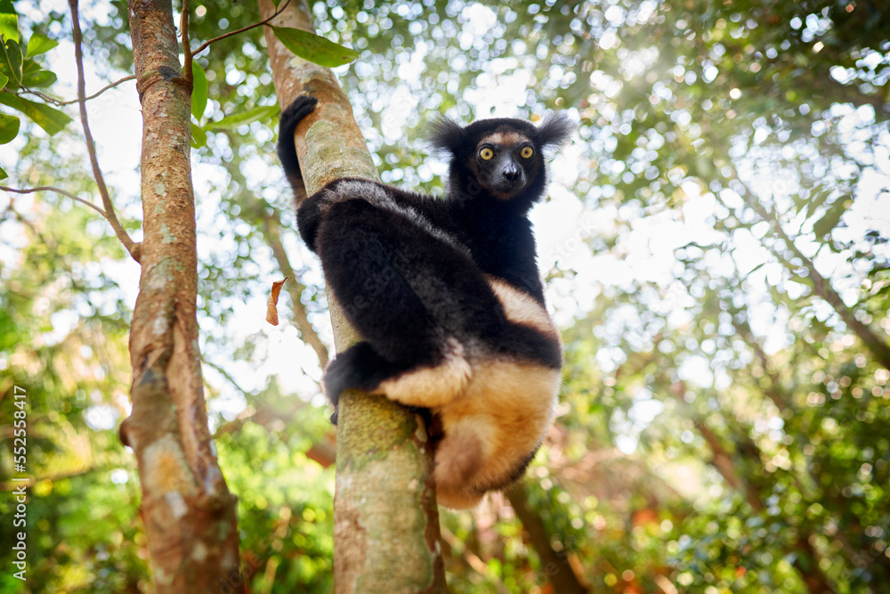 Wildlife Madagascar, babakoto, Indri indri, monkey with young babe cub in Kirindy Forest, Madagascar. Lemur in the nature habitat. Sifaka on the tree, sunny day. Largest living lemur.
