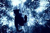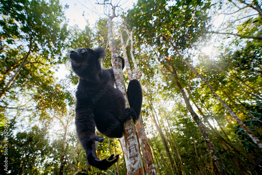 Wildlife Madagascar, babakoto, Indri indri, monkey with young babe cub in Kirindy Forest, Madagascar. Lemur in the nature habitat. Sifaka on the tree, sunny day. Largest living lemur.
