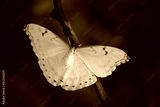White butterfly on green leaves in tropic jungle. Morpho polyphemus, the white morpho, white butterfly of Mexico and Central America. Exotic insect in the nature tropical habitat.