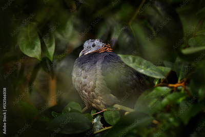 Ashy Woodpigeon, Columba pulchricollis, bird on the nature forest habitat, China. Pigeon in the green tree vegetation. Birdwatching in Asia. Wildlife nature. Grey dove in habitat.