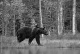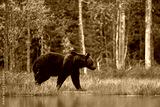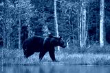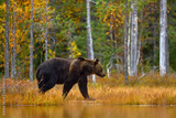 Bear hidden in orange red forest. Autumn trees with bear. Beautiful brown bear walking around lake with fall colours. Dangerous animal in the wood. Wildlife nature from Finland.