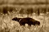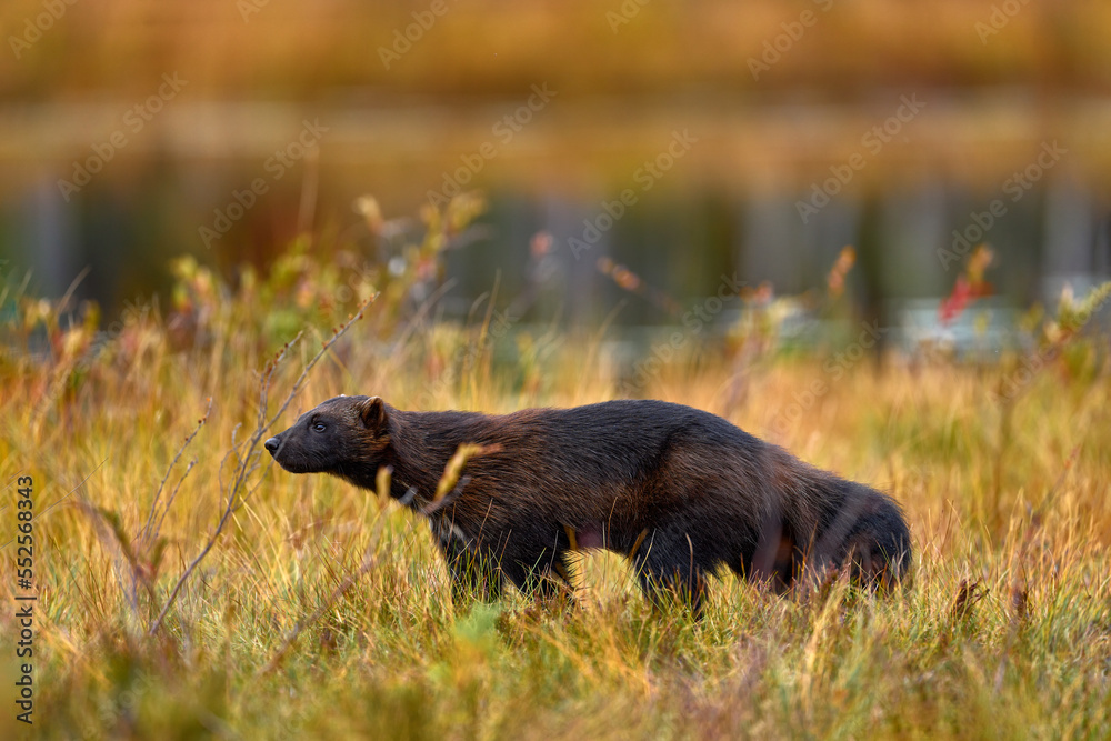 Wolverine sunset. Wolverine running in autumn golden grass. Animal behaviour in the habitat, Finland. Wolverine in Finnish taiga. Wildlife scene from nature. Rare running animal from north Europe.