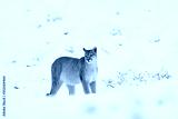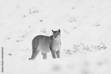 Puma, nature winter habitat with snow, Torres del Paine, Chile. Wild big cat Cougar, Puma concolor, hidden portrait of dangerous animal with stone. Mountain Lion. Wildlife scene from nature.