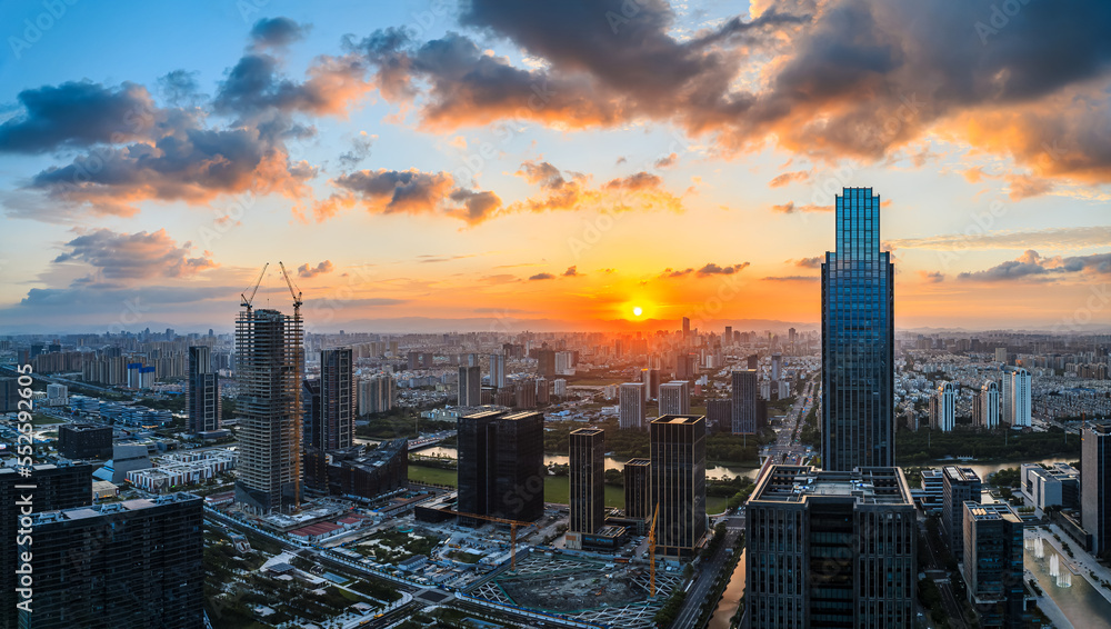 Aerial view of city skyline and modern buildings at sunrise in Ningbo, Zhejiang Province, China. East new town of Ningbo, It is the economic, cultural and commercial center of Ningbo City.