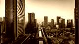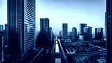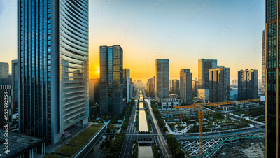 Aerial view of city skyline and modern buildings at sunrise in Ningbo, Zhejiang Province, China. East new town of Ningbo, It is the economic, cultural and commercial center of Ningbo City.
