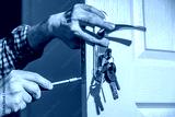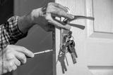 Door lock installation, repair, or replacement service. Door hardware installer locksmith working with open white door indoor. Keychain close-up, new dwelling or moving house