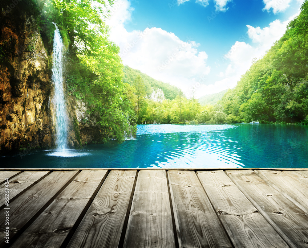 waterfall in deep forest of croatia and wood pier