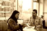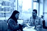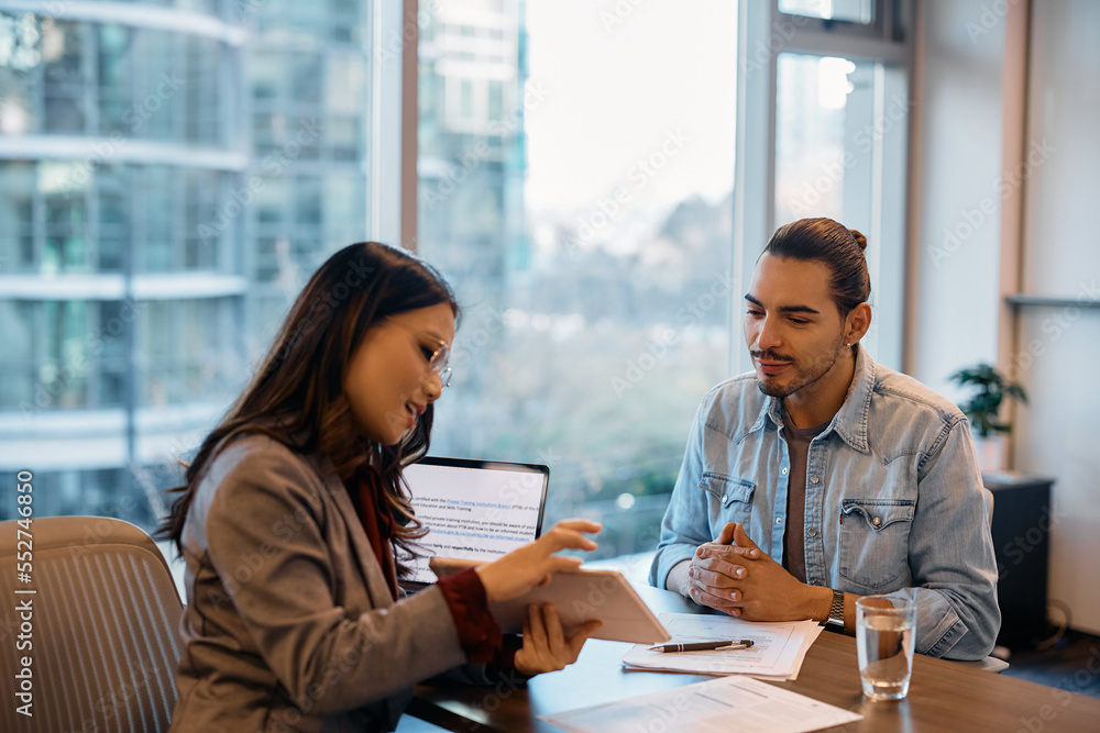 Young Hispanic man having meeting with member of human resource team in office.