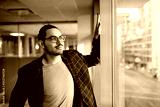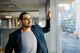 Smiling Hispanic entrepreneur day dreaming while looking through window of his office.