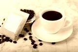 Drip coffee bags, coffee beans and a white cup on a texture table. Ground coffee for brewing in a cup, paper bag drip coffee filter packaging. Place to copy. Place for text.
