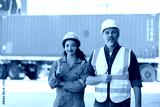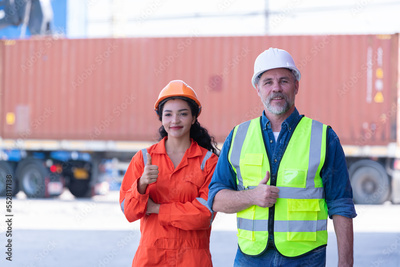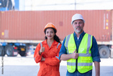 Portrait Engineer worker under working inspection and checking with radio communication ,file document container dock yard shipping dock yard logistics export import business concept.