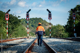 Engineer under inspection and checking construction process railway switch and checking work on railroad station .Engineer wearing safety uniform and safety helmet in work