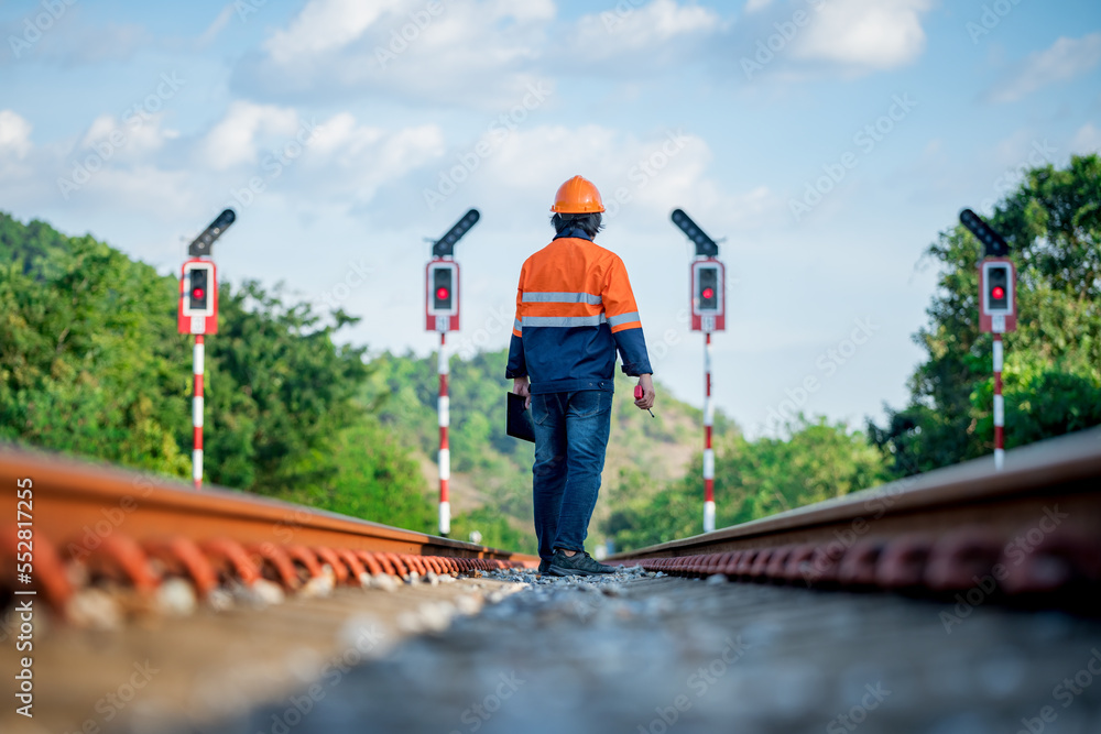 Engineer under inspection and checking construction process railway switch and checking work on railroad station .Engineer wearing safety uniform and safety helmet in work