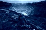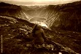 Young tourist woman in red jacket watching the view on the beautiful Ringedalsvatnet Lake. Hiking in Norwegian nature in windy weather.