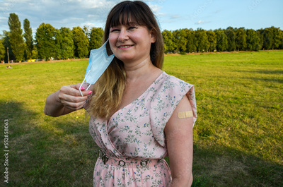 A smiling woman showing plaster on hand after getting Covid-19 vaccine injection and taking off a disposable face mask. Return to normal life after vaccination