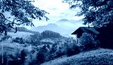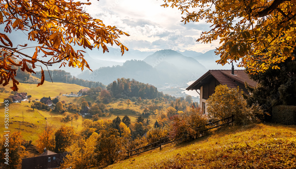 Autumn mountain valley. Autumn landscape beautiful colored trees over the green meadow glowing in sunlight. Beautiful natural landscape in the autumn time. Switzerland