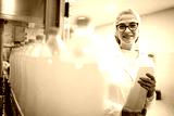Food factory female supervisor standing in bottling plant and holding orange juice bottle.