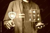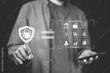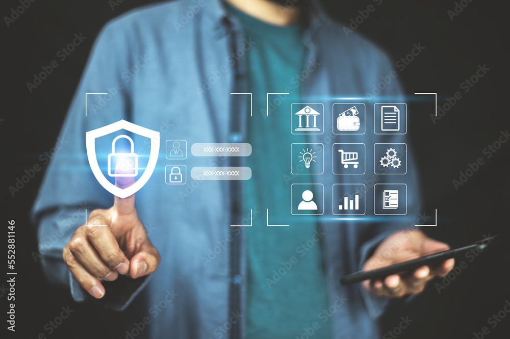 Businessman using password Cybersecurity and privacy concepts to protect data. Lock icon internet network security technology. Businessmen protecting personal data on laptop and virtual interfaces.