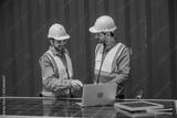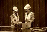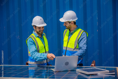 solar power plant engineers meeting and examining photovoltaic panels. Concept of alternative energy and its service. Engineer energy power man worker at site.