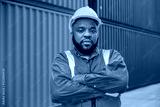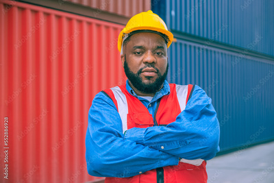 worker container shipment, worker working in container port terminal. Attractive male engineer people process orders and product at warehouse logistic in cargo freight ship for import export in harbor