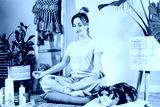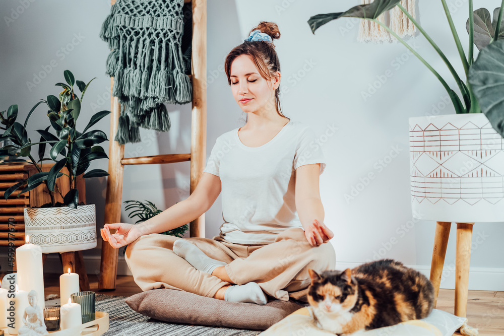 Young healthy woman practicing meditation at home, sitting in lotus position on floor cushion with relaxed cat pet in modern Scandi interior home. Meditating, relaxed, eyes closed. Selective focus.