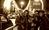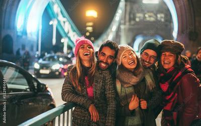 Portrait of young friends having fun outdoor with London Tower Bridge in background - Travel and friendship concept - Soft focus on center girl face