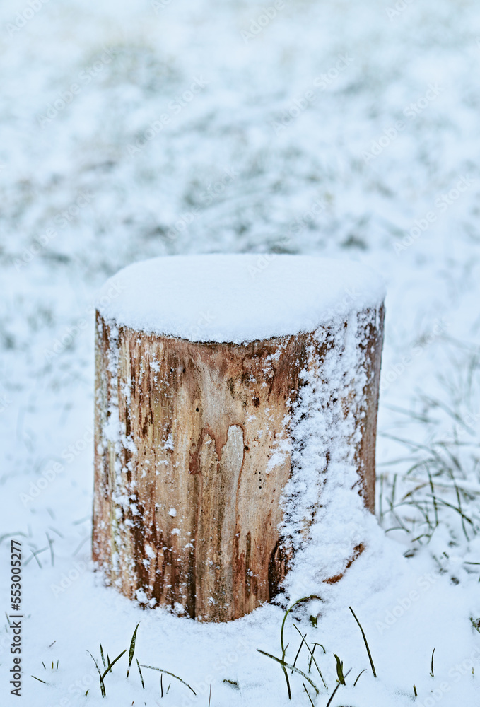 Tree trunk in snow. Winter scenery.