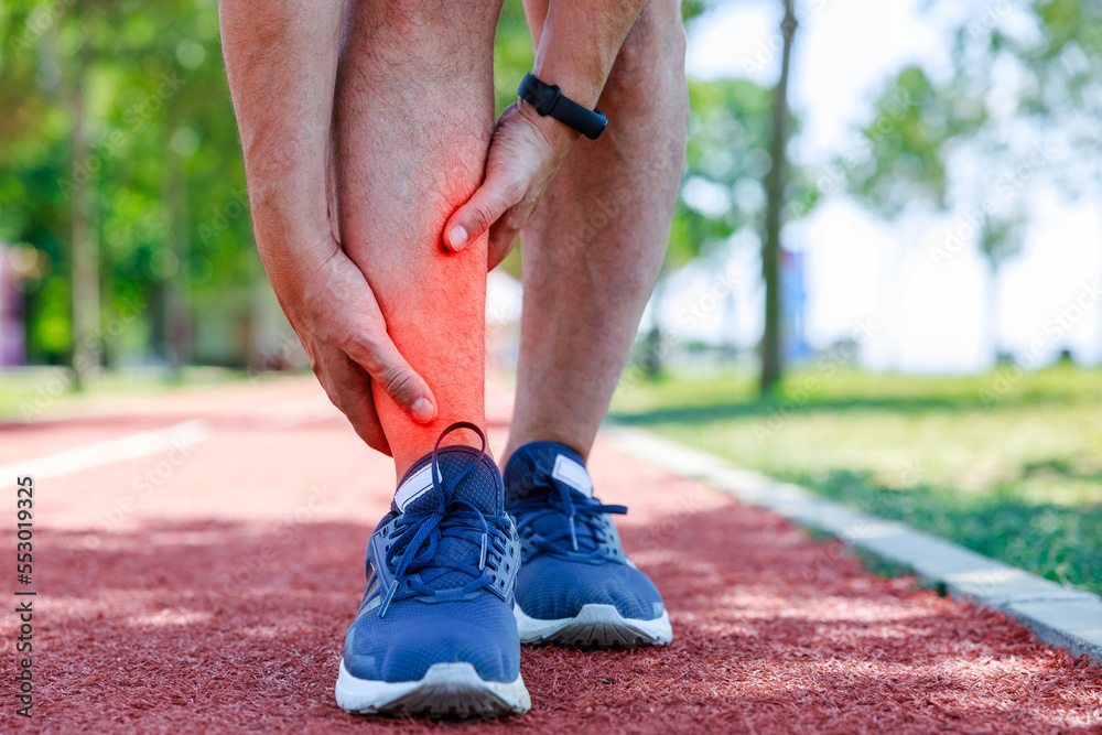 Young man feeling pain in her ankle.